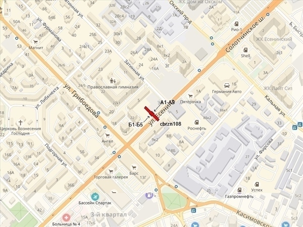 Есенина ул., 16, 150м до ул.Грибоедова, ТЦ"Барс" и "Торговая галерея", справа при движении в центр (сторона Б - при движении к Солотчинскому шоссе, 200м до ТЦ "Евпатий Коловрат" и автосалона "Германия авто")